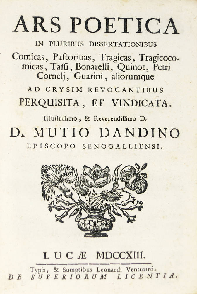ARS Poetica in pluribus dissertationibus. Comicas, Pastoribus, Tragicas, Tragicomicas, Tassi, Binarelli, Quinot, Petri Cornelj, Guarini, aliorumque...Illustrissimo...D. Mutio Dandino Episcopo Senogalliensis.