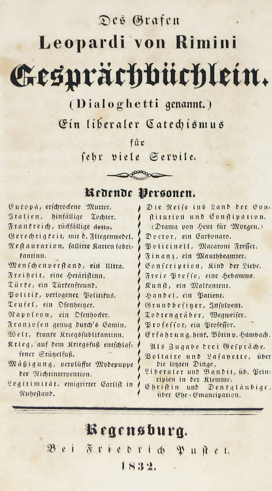 Des Grafen Leopardi von Rimini Gespräch Büchlein. (Dialoghetti genannt.) ein liberaler Catechismus für sehr viele Servile.