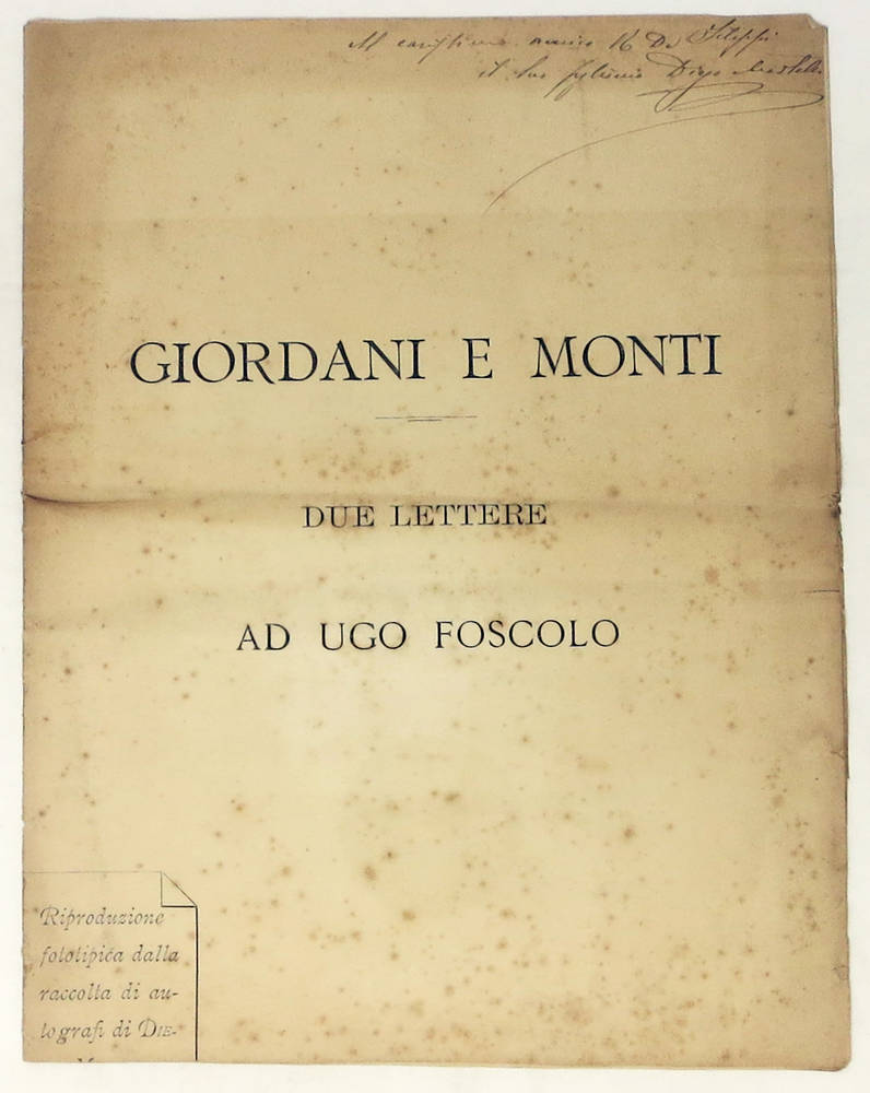 Due lettere ad Ugo Foscolo, (a cura di) Diego Martelli e da questi dedicate "all'Onorevole dott. Agostino Bertani Deputato al Parlamento Italiano". Con "Riproduzione fototipica dalla raccolta di autografi di Diego Martelli".