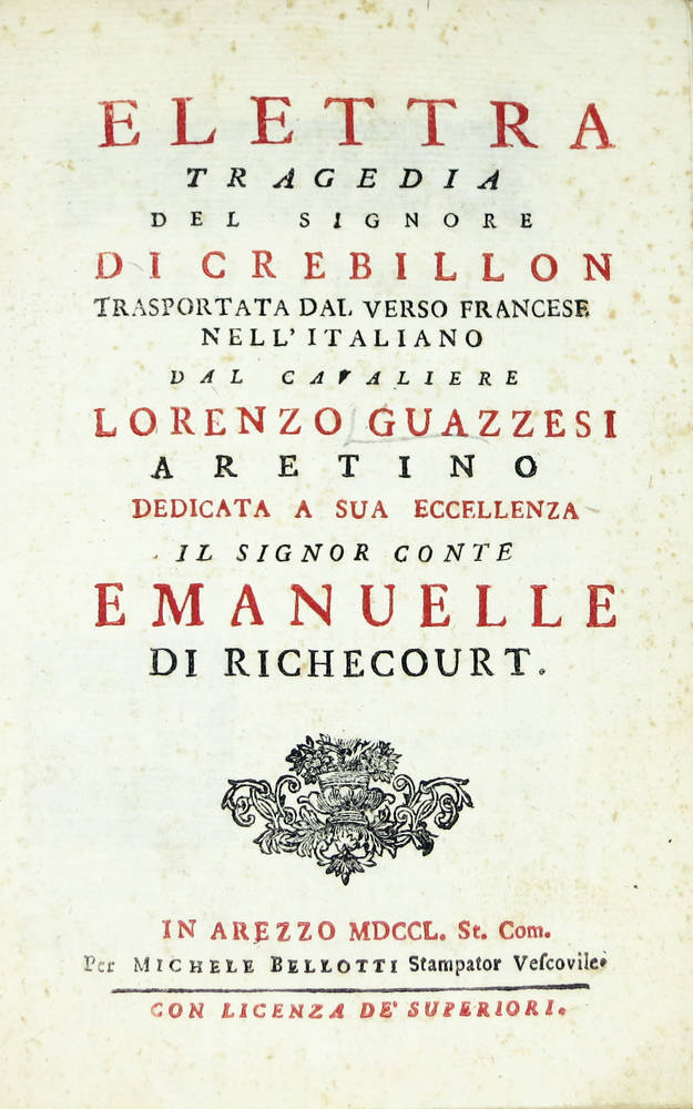 Elettra. Tragedia..., trasportata dal verso francese nell'italiano dal cav. Lorenzo Guazzesi Aretino.