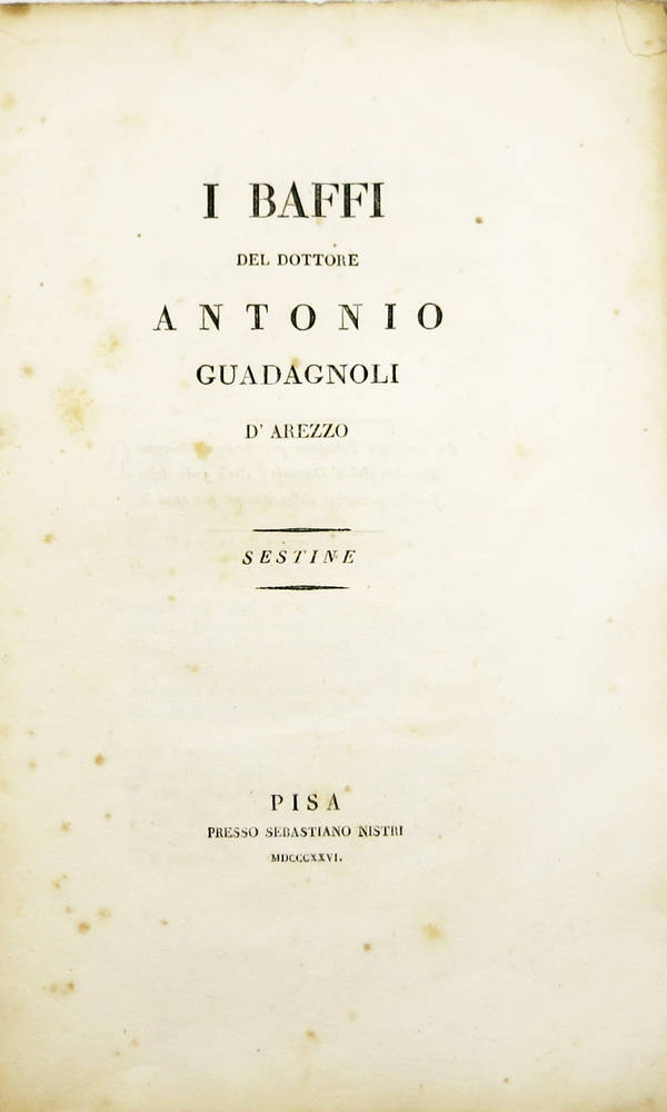 Prima edizione, non comune. Parenti, 280. Antonio Guadagnoli (1798-1858), di Arezzo, fu poeta faceto e satirico, morto a Cortona.