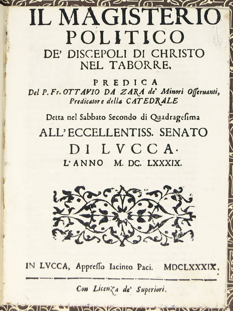 Il magisterio politico de'discepoli di Christo nel Taborre. Predica..., detta nel Sabbato Secondo di Quaresima all'Eccellentiss. Senato di Lucca, l'anno M. DC. LXXXIX.