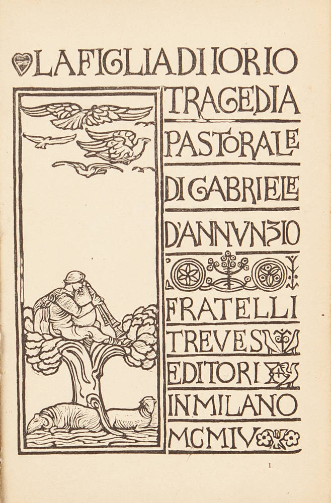In-16° (mm 180x120). Pagine 166, (1), e 1 bianca. Testo arricchito da innumerevoli illustrazioni xilografiche di De Carolis alcune a piena pagina. Brossura editoriale ampiamente figurata in xilografia in rosso di De Carolis al recto e verso. Rare fioriture ma ottimo esemplare.
