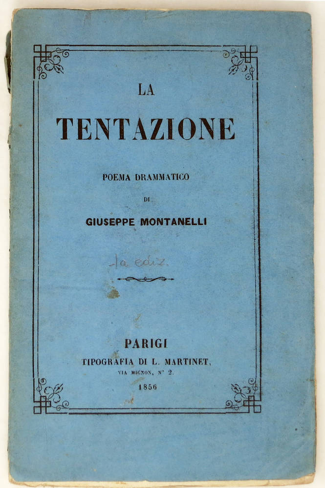 Edizione originale. Parenti, 350. Giuseppe Montanelli (Fucecchio 1813-1862). Guidò i volontari toscani nella battaglia risorgimentale di Curtatone e Montanara e fece parte del governo provvisorio nel 1848; nonno di Indro Montanelli.
