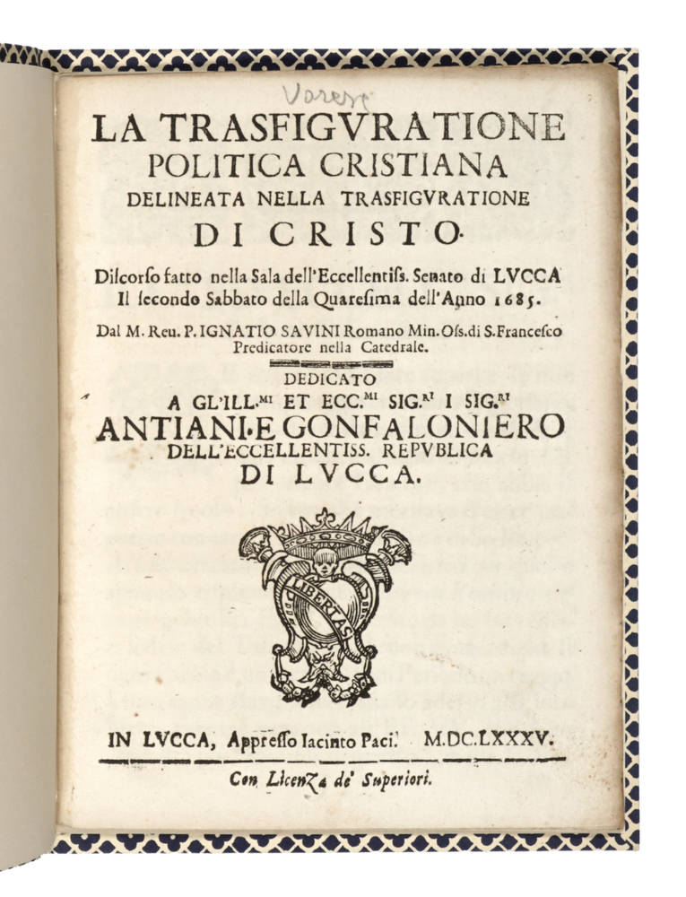 La Trasfiguratione politica cristiana delineata nella Trasfiguratione di Cristo. Discorso fatto nella Sala dell'Eccellentiss.mo Senato di Lucca il secondo Sabbato della Quaresima dell'anno 1685.