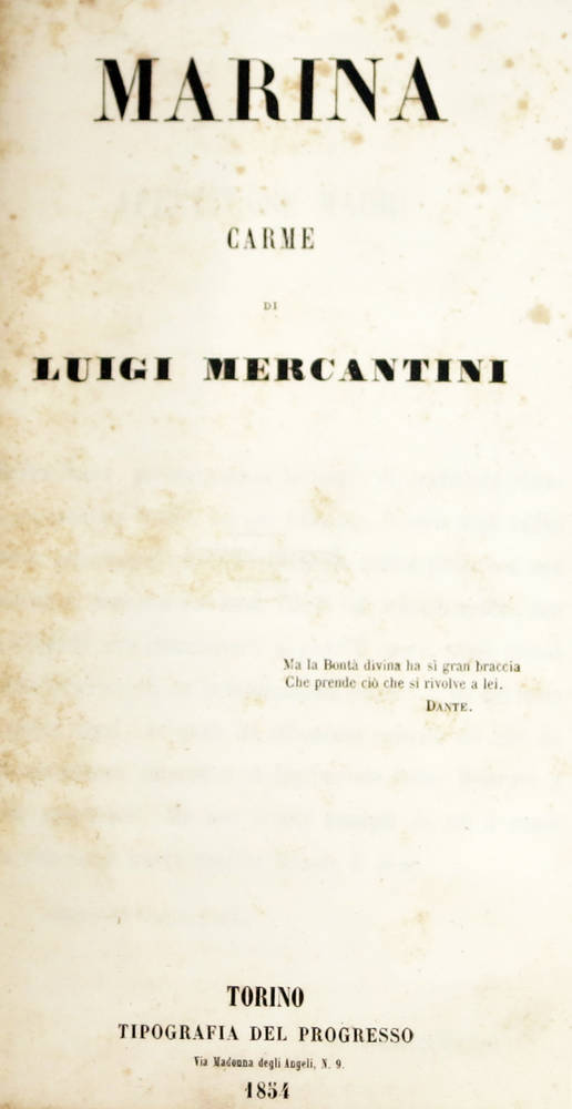 Edizione originale. Luigi Mercantini (1821-1872), di Ripatransone, cantò con inni guerreschi la rivoluzione italiana (Inno a Garibaldi); morì a Palermo.