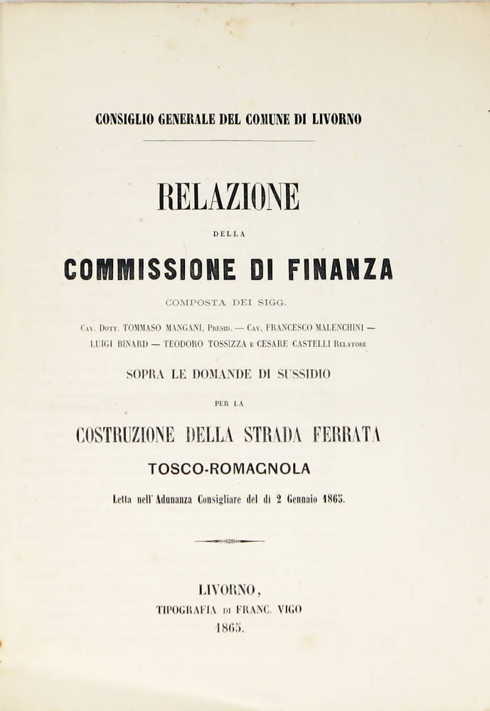 Relazione della Commissione di finanza...sopra le domande di sussidio per la costruzione della strada ferrata tosco-romagnola letta nell'Adunanza Consigliare del dì 2 Gennaio 1865. (Consiglio generale del Comune di Livorno).