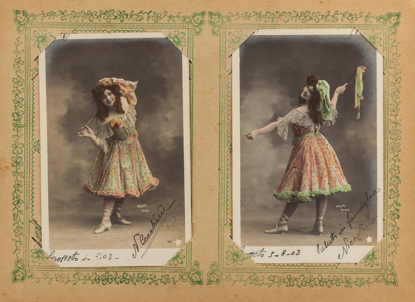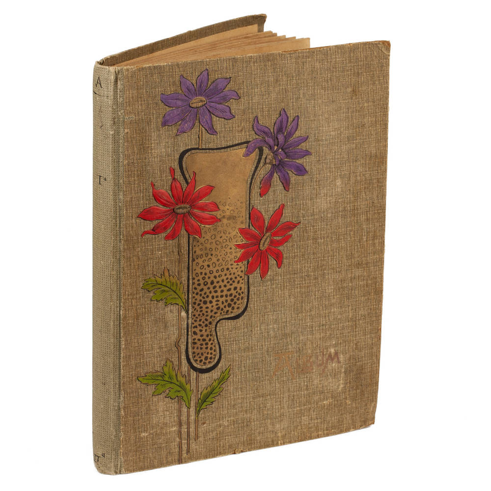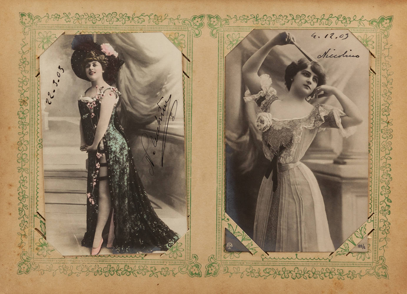ALBUM di n. 86 cartoline, di cui 29 raffiguranti attrici di varietà e figure femminili varie; 1 raffigura un paesaggio di mantagna; 56 della serie dei papi (probabilmente completa, numerata 1-56). Montate in album liberty (mm 255x180), con dec. floreale al piatto sup. Legatura in tutta tela un poco lisa.