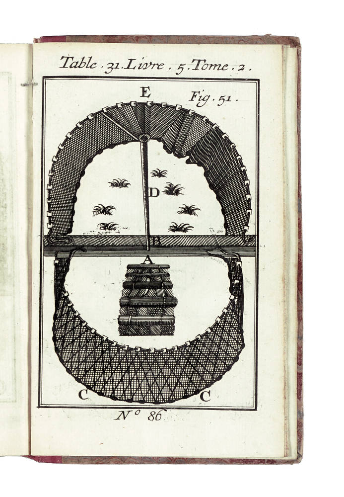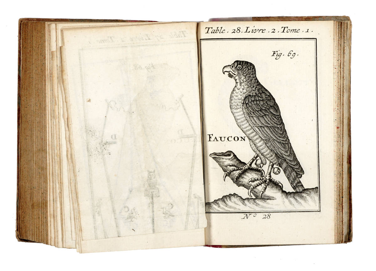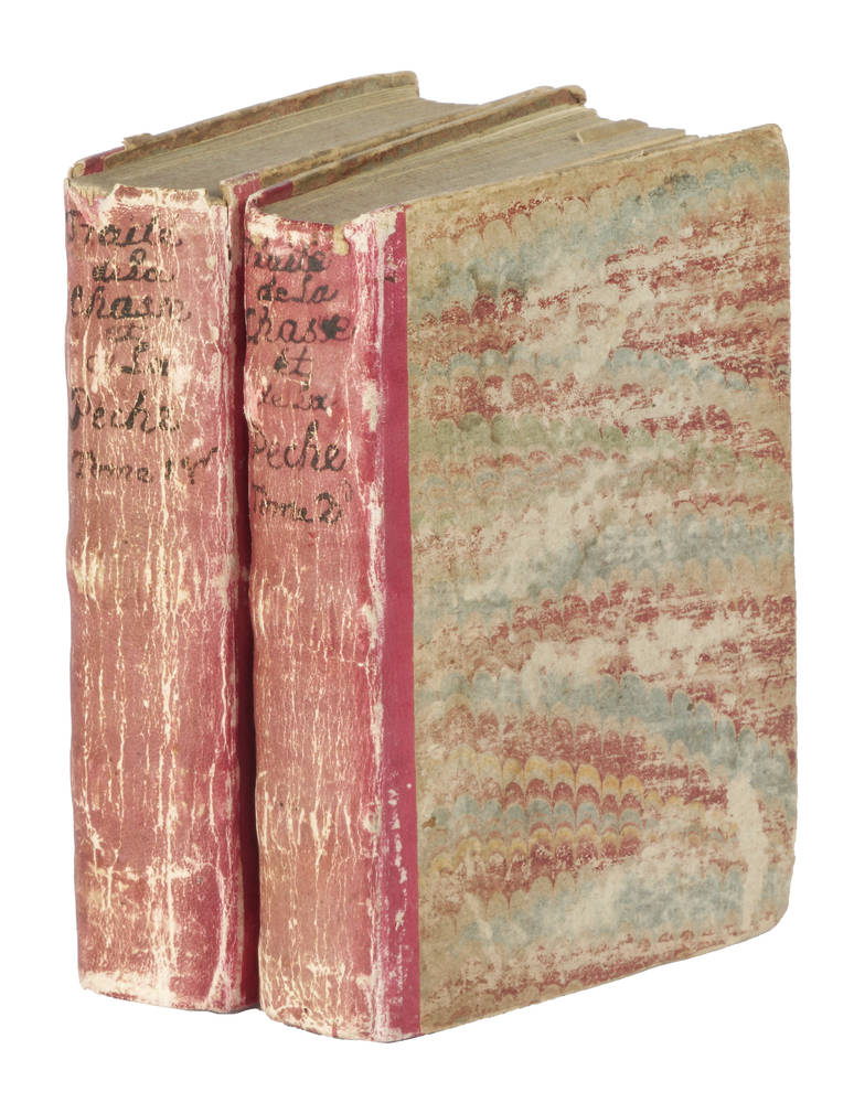 2 volumi in-12°(mm 156x100),Pagine [4], XIV, 391; [8], 284 + C arte [38] per le "Dictionnaire des termes de Chasse, de Velerie et de Péche ..." con 90 tavole fuori testo, alcune ripieg., in rame. Titoli in rosso e nero. Cartonato coevo un poco liso, titolo manoscritto sul dorso, ex-libris al piatto anteriore interno e alle carte di sguardia dei 2 voll. Piatti marmorizzati e leggermente consunti. Ottimo esemplare internamente.