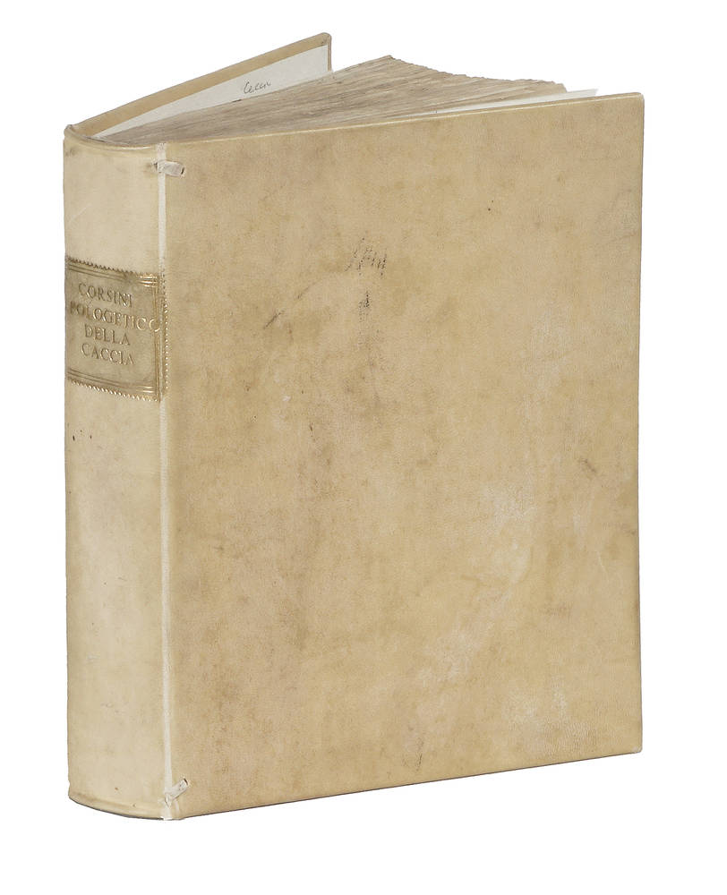 Edizione originale e unica di rara opera classica. È questa la prima opera italiana in difesa della caccia. Ceresoli, 171. Lastri, 38. Vinciana, 1888: "In quest'opera la caccia è osservata più dal punto di vista morale e igienico che non da quello descrittivo di diporti in quel tempo. Interessante è particolarmente il libro 5°: "Ove si dichiara in che modo questo esercitio inserva alla medicina preservativa, che altrimente gimnastica salutare viene nomata".