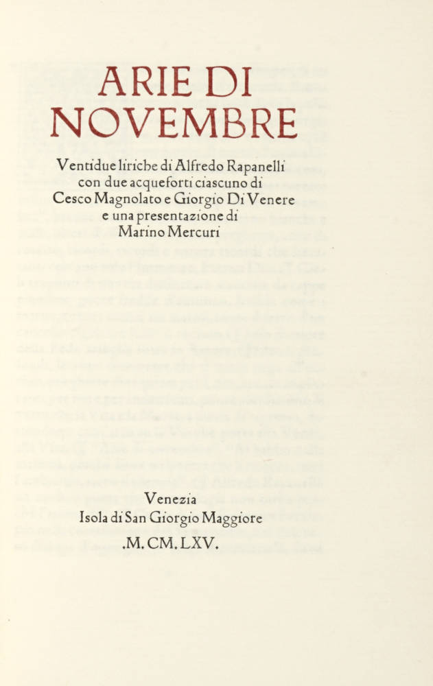 Arie di Novembre. Ventidue liriche di Alfredo Rapanelli con due acqueforti ciascuna di Cesco Magnolato e Giorgio di Venere e una presentazione di Marino Mercuri.