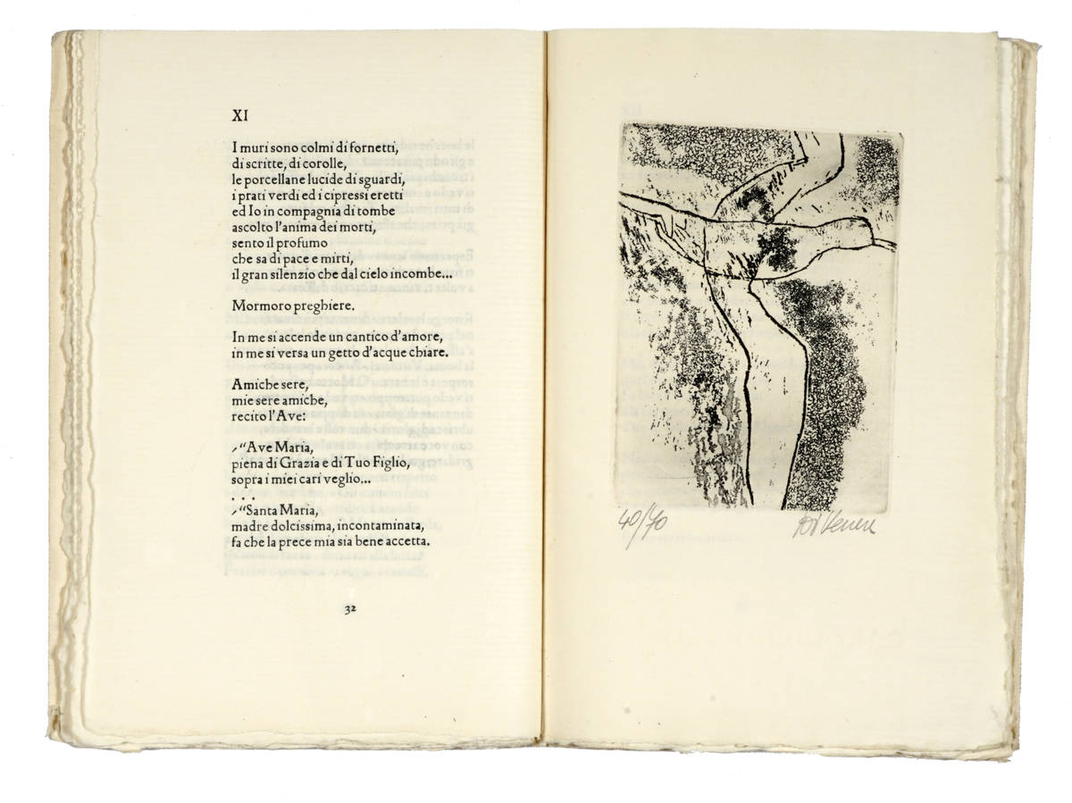 Edizione numerata a 100 esemplari, composta con carattere "Inkunabula" e stampata, su carta a mano, della cartiera Miliani di Fabriano, nella Scuola Grafica del Centro Arti e Mestieri della Fondazione Giorgio Cini di Venezia. Esemplare N.40.