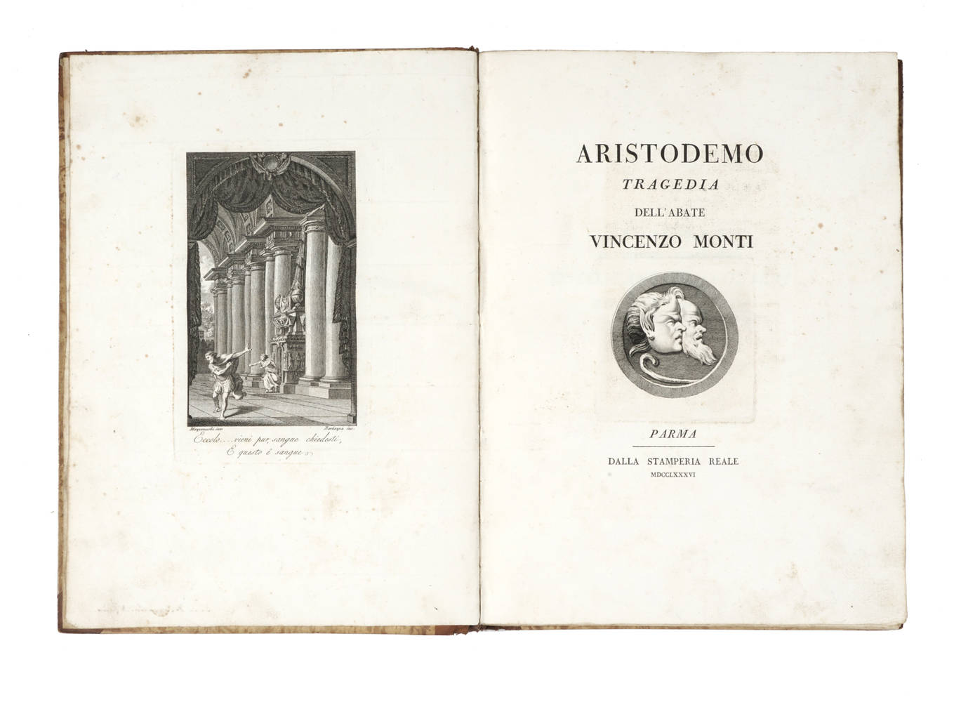 In-4° real-folio (mm 300x220), Antip. inc. in rame da Barbazza, su dis. di Mazzoneschi, Carte [5], Pagine 130. Privo dell'ultima carta bianca. Sotto il titolo, inc. in rame (le maschere). Legatura in mezza pelle coeva con decorazioni e fregi oro al dorso, piatti in cartone marmorizzato. Buon esemplare ad ampi margini.