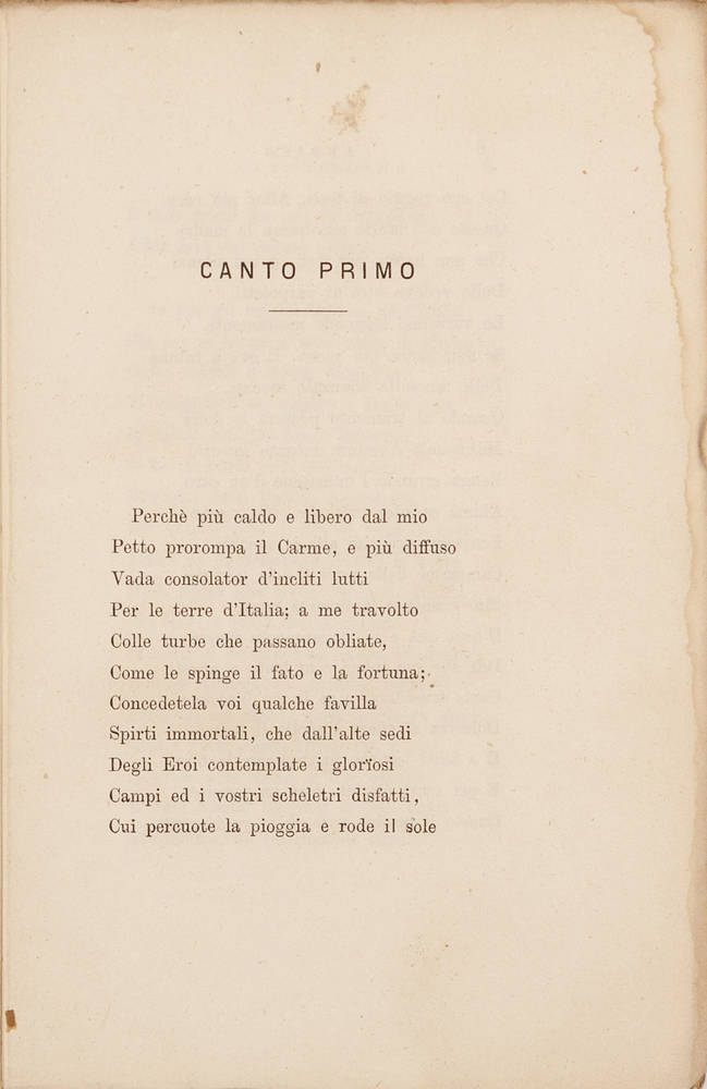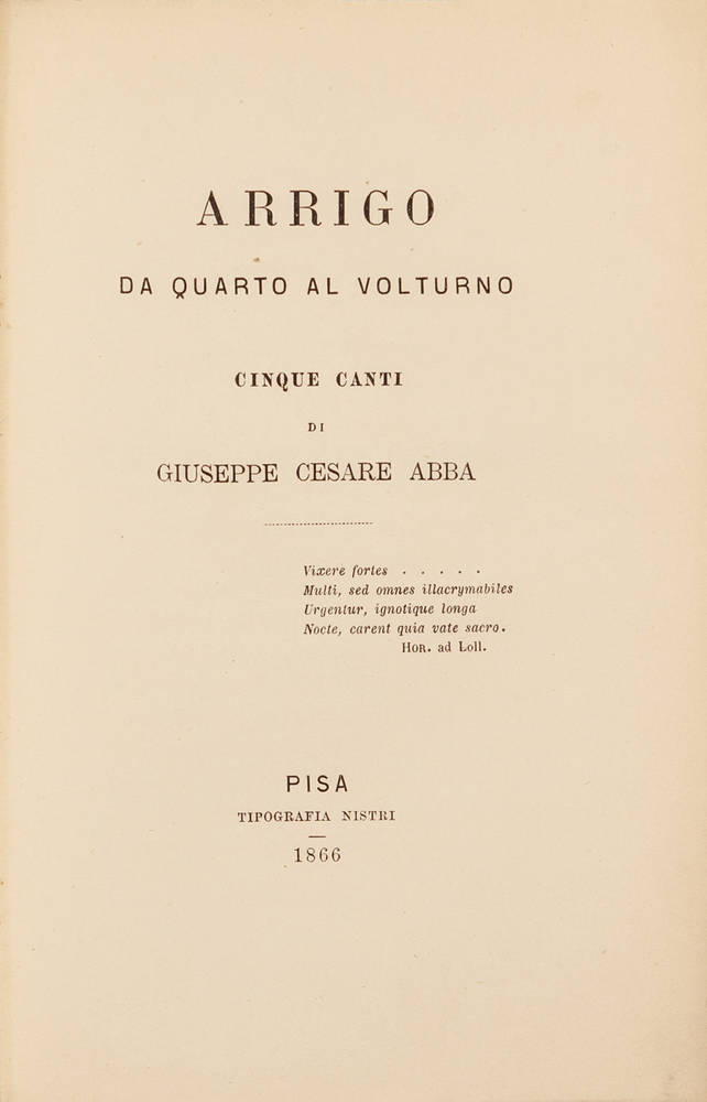 Giuseppe Cesare Abba nacque a Cairo-Montenotte (Savona) nel 1838 e morì nel 1910 a Brescia. Partecipò alla guerra del 1859, alla spedizione dei Mille, e poi alla guerra del 1866 come volontario garibaldino. La sua fama è legata alla rievocazione, sotto forma di diario, della giovanile avventura garibaldina: Da Quarto al Volturno nella quale il protagonista, Arrigo è, come l'autore, un volontario garibaldino. Il libro fu stampato a spese degli amici quasi a malincuore e prima di partire per la guerra del '66 […] soltanto perché rimanesse qualcosa di me se fossi morto nella vicina guerra. Prima edizione rarissima. Parenti, 9; Biancardi-Francese, 15; Pagliaini, I, 2.