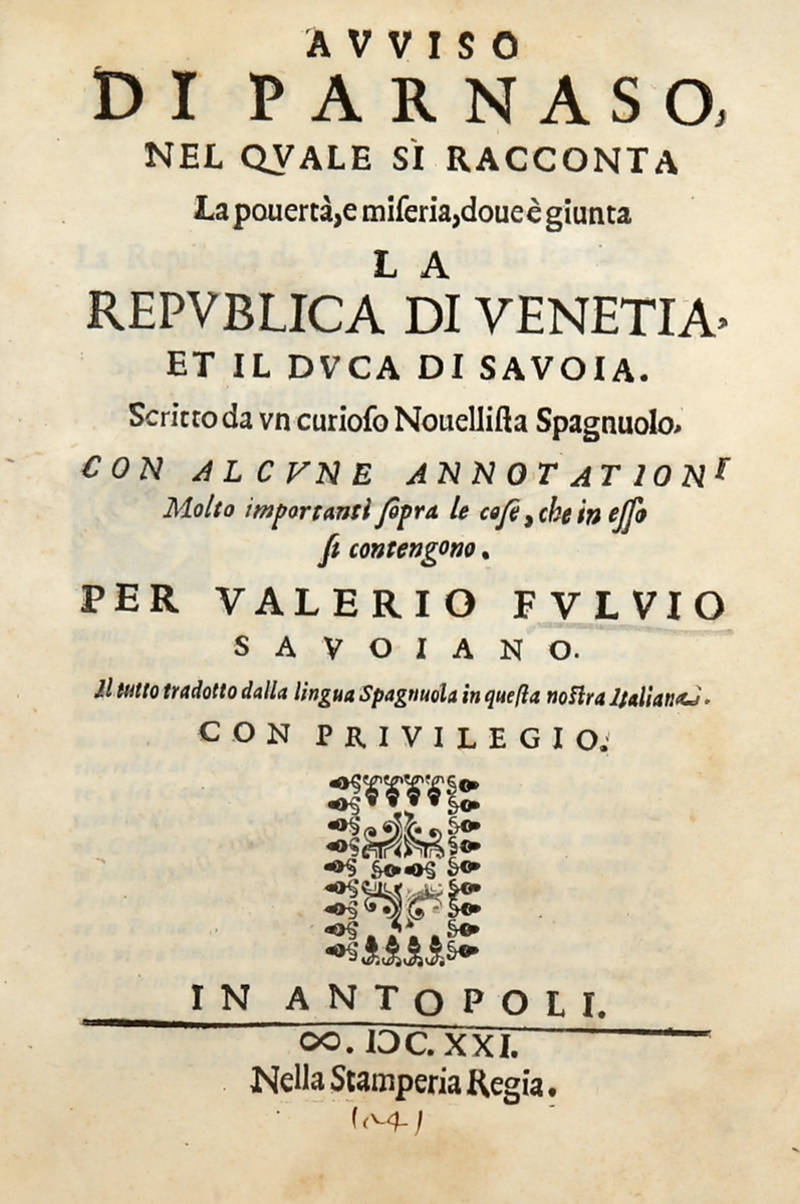 Avviso di Parnaso, nel quali si racconta la povertà, e miseria, dove è giunta la Republica di Venetia, et il Duca di Savoia. Scritto da un curioso Novellista Spagnuolo. Con alcune Annotationi molto importanti sopra le cose, che in esso si contengono...