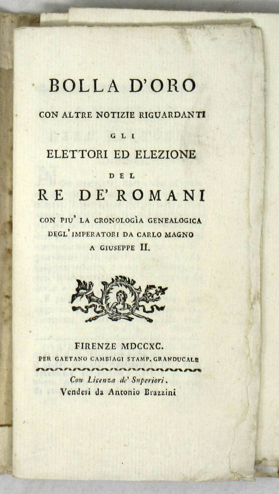 BOLLA d'oro/ con altre notizie riguardanti/ gli/ elettori ed elezione/ del/ Re de' Romani/ con più la cronologìa genealogica/ degl'imperatori da Carlo Magno/ a Giuseppe II.