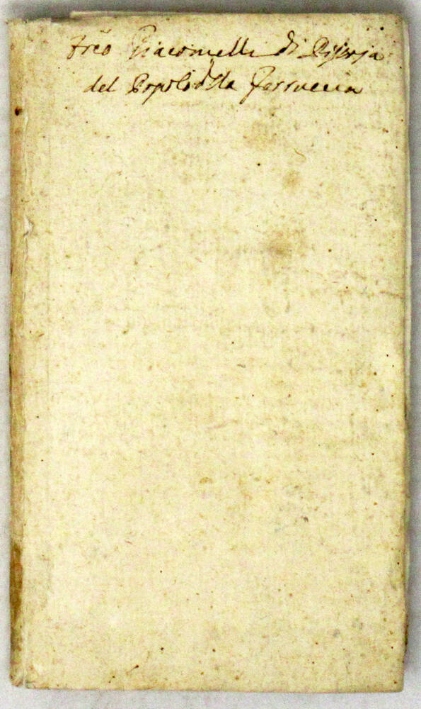In-16°, pagine 118. Cartonato coevo allentato, titolo manoscritto al dorso. Ex-libris manoscritto: "Giacomelli di Pistoia" al piatto anteriore. Buon esemplare, con barbe.