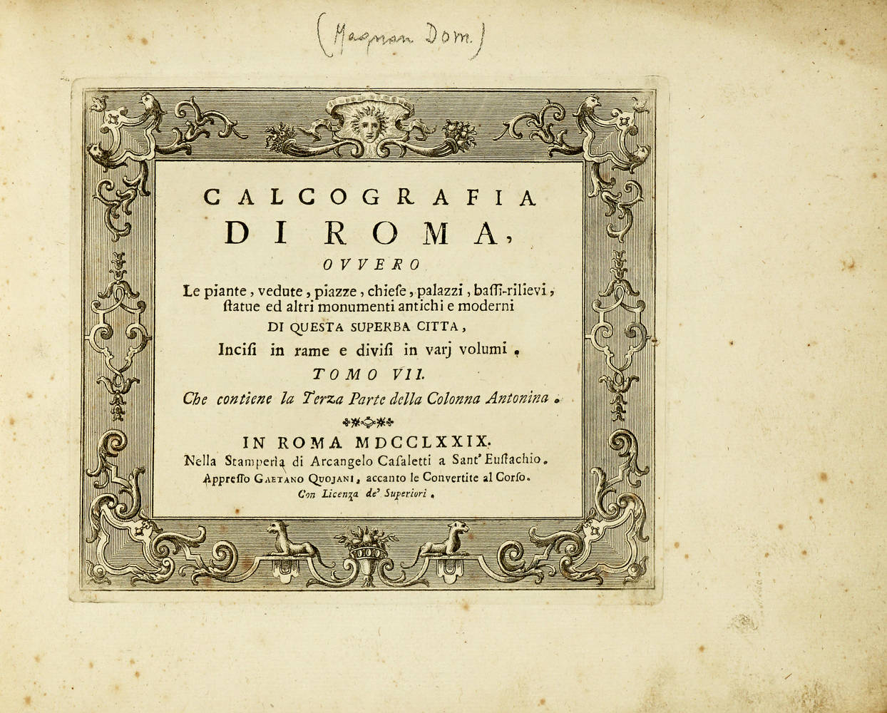 In Roma, nella stamp. di Arcangelo Casaletti a Sant'Eustachio, appresso Gaetano Quojani, accanto le Convertite al Corso, 1779.