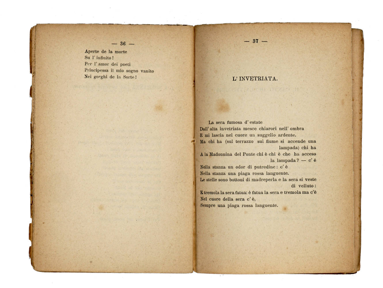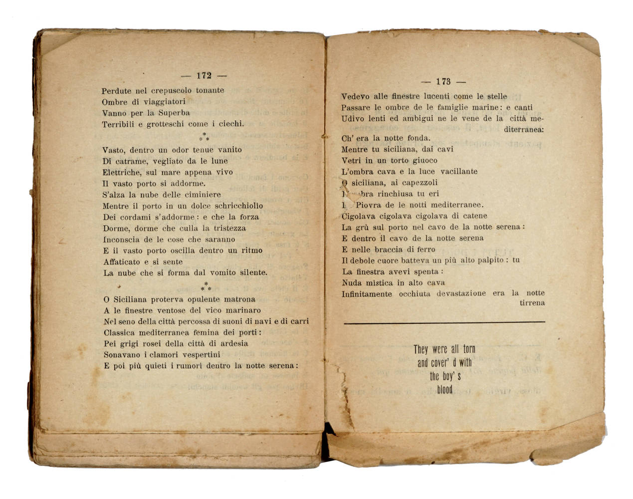 In-8° (mm 195x127), pagine 173, [1]. Brossura editoriale con qualche strappetto, macchia e ingiallitura. Dorso parzialmente liso, ma con titolo integro. Custodia in mezza tela mod. Timbro di appartenenza: "Nadia & Emilia Mestica" sul piatto sup. e sul front. Strappata la pagina della dedica al Kaiser Guglielmo di Prussia. Cancellata a penna (ma leggibile) la scritta: "Die Tragödie..." sul frontespizio e sulla quarta di copertina. Esemplare con errata corrige (nella dizione E. C.) sul verso dell'ultima pagina (che presenta anche qualche minima perdita). Il fascicolo delle pagine 119-134 è più corto di qualche mm ; la parte finale con le pagine 135-173 ancora più corta, come si riscontra in un certo numero di esemplari così usciti per primi dalla tipografia. Il nostro, inoltre, presenta caratteristiche sinora altrove non riscontrate, ossia pagine stampate al verso di altre per sbaglio e con notevole confusione nella sequenza dell'ultima parte del testo. Si tratta con ogni probabilità di uno dei primissimi esemplari "sbagliati" uscito dalle stampe ma, nonostante ciò, ugualmente rilegato e messo in circolazione. Siamo pertanto di fronte ad una rarità bibliografica che aggiunge un altro "passaggio" nella faticosa e avventurosa pubblicazione degli Orfici. Come è noto la fase di stampa del libro presso Ravagli fu oltremodo tribolata, col poeta che ossessivamente stava in tipografia a controllare e contestare.