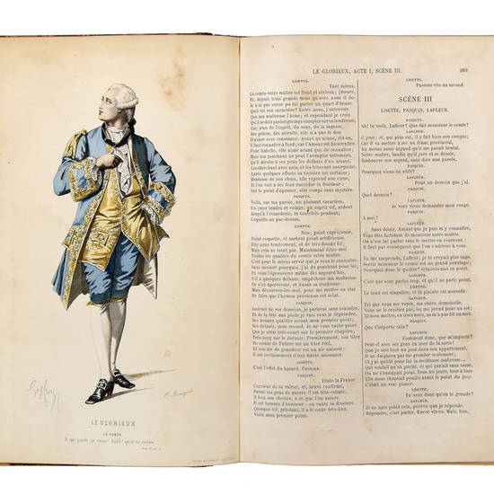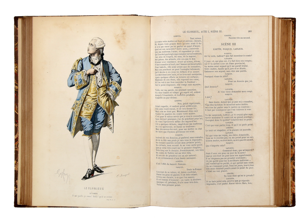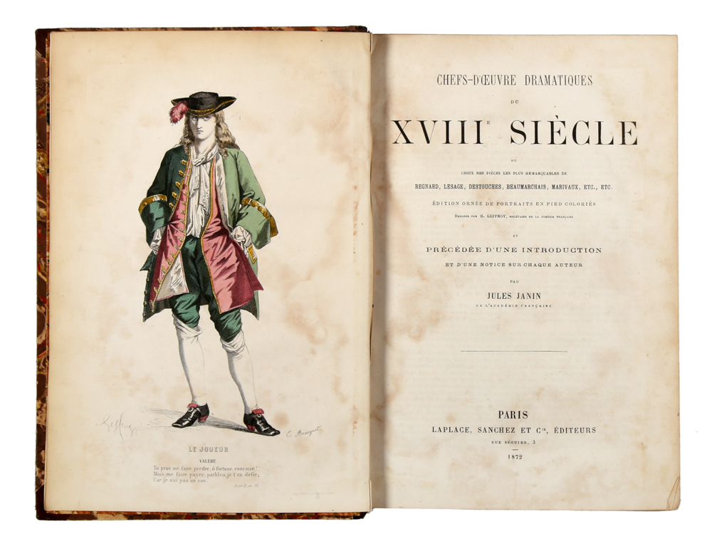 CHEFS-d'oeuvre dramatiques du XVIII.e siècle ou Choix des pièces les plus remarquables de Regnard, Lesage, Destouches, Béaumarchais, Marivaux, etc., etc. Edition ornée de portraits en pied coloriés, dessinés par M. Geffroy...