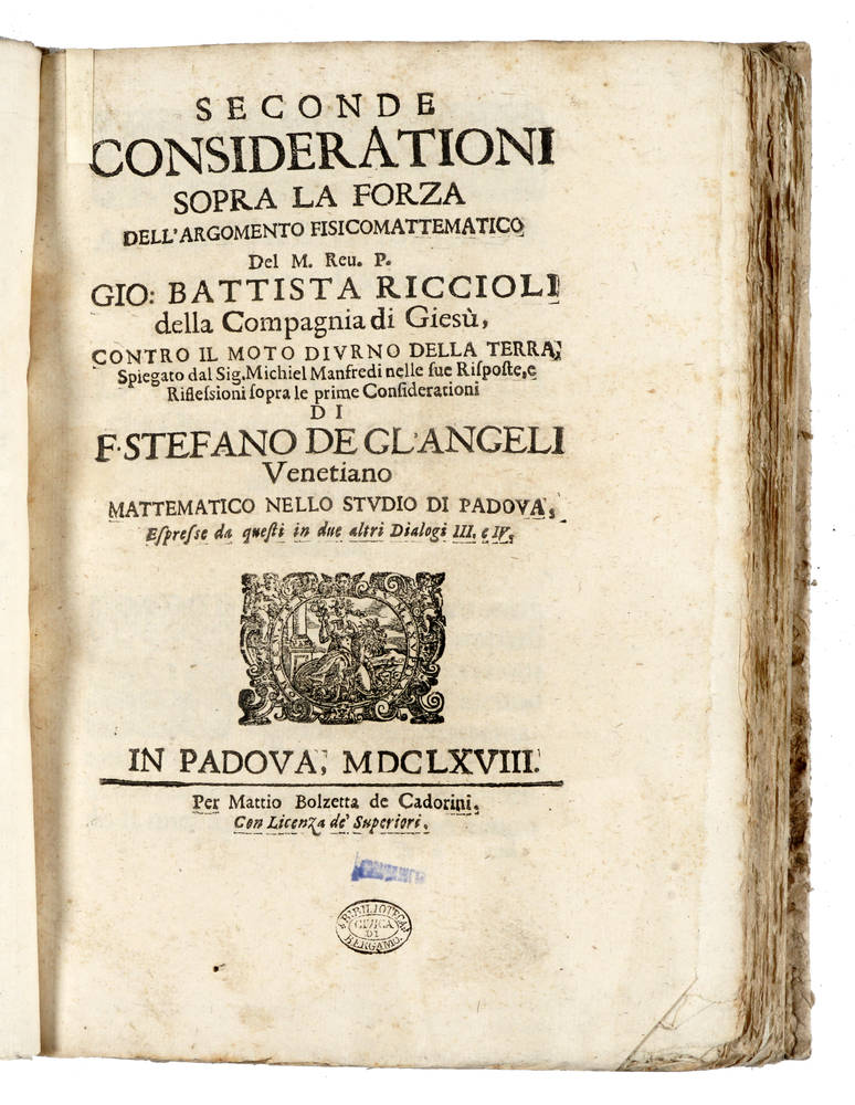 Esemplare molto raro, soprattutto perchè completo delle quattro parti, che spesso si trovano separate. Carli-Favaro, 301, 309, 310, 321. Riccardi I, 35-36." E' raro il rinvenire uniti questi quattro ultimi libri del nostro autore, i quali interessano assai la storia della quistione sul moto della terra. Una tale raccolta perciò meritava essere registrata dal Brunet". (anche Graesse non lo cita). Vinciana, 1498, registra soltanto le Seconde considerationi, Choix non la cita per niente. Sconosciuto a Cinti e a Houzeau-Lancaster.