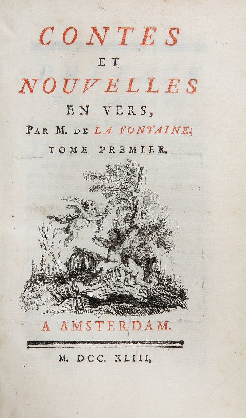 2 volumi in-8° piccolo (mm 163x102), Pagine [6], XIV, 224, [2]; [8], 268, [2], con 70 vignette a mezza pagina delineate da Cochin, titolo in rosso e nero con vignetta. Bella legatura moderna in piena pelle rossa con dec. in oro e sguardie marmorizzate. Esemplare con piccolo restauro marginale al frontespizio del tomo II, inoltre le carte bianche finali dei 2 volumi sono mancanti (sostituite da carte moderne). Buon esemplare.