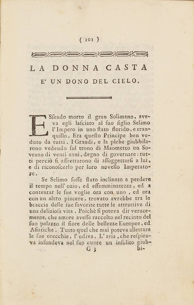 L'opera è dedicata "alla mia signora amabile N.***" dall'autore che si firma "Vostro affezionato servitore N.***" (pagine 3-4). Vengono raccontate quattro divertenti storie galanti, che hanno per titolo: 1) Istoria di d'Orninval 2) Istoria di madamigella Rosa 3) Istoria di Aurora 4) La donna casta è un dono del cielo.