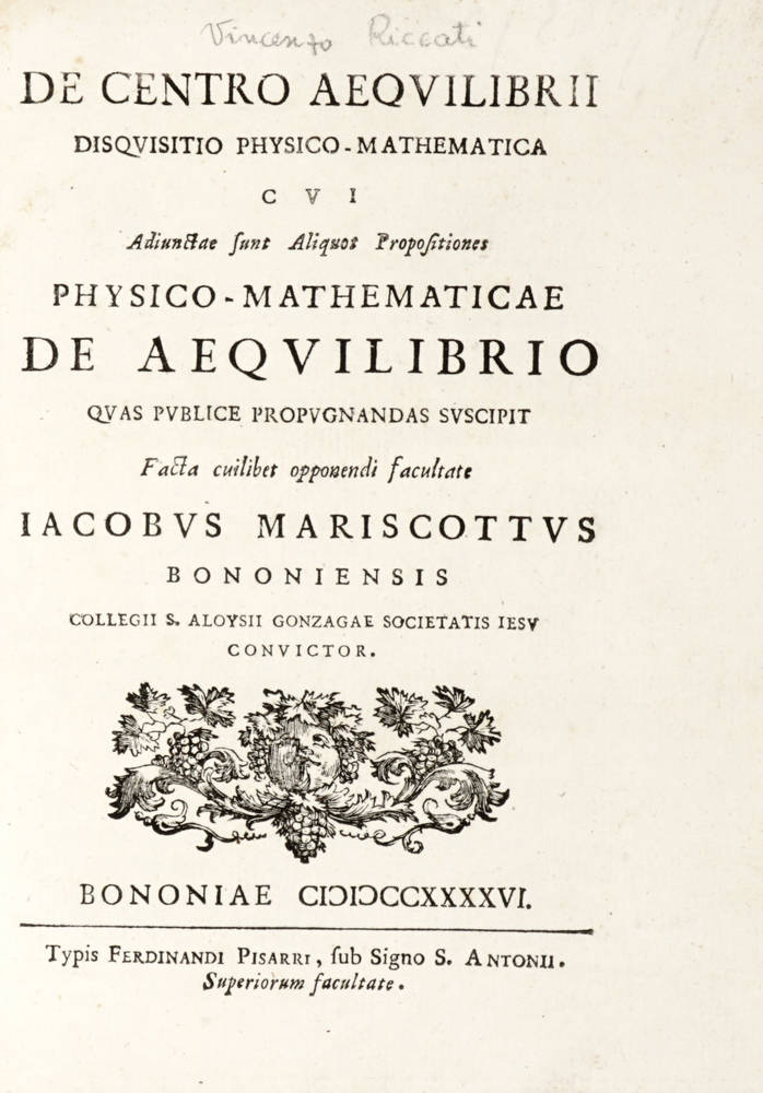 De Centro Aequilibrii/ Disquisitio Physico-Mathematica/ cui/ Adiunctae sunt Aliquos Propositiones/ Physico-Mathematicae/ De Aequilibrio/ quas publice propugnandas suscipit/ Facta cuilibet opponendi facultate/ Iacobus Mariscottus/ Bononiensis...