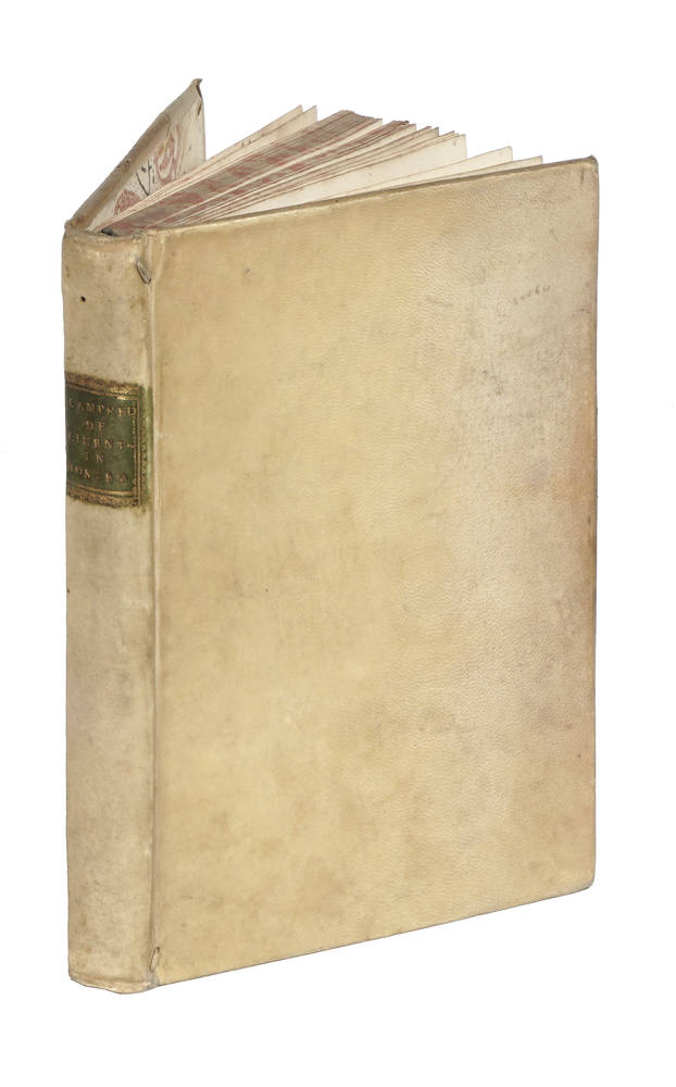 In-8°, pagine XII (manca l'occhietto), 131. Frontespizio in rosso e nero. Buona condizione interna. Legatura in piena pergamena originale, titolo oro su tassello verde al dorso. Restauro marginale all'angolo del piatto posteriore.