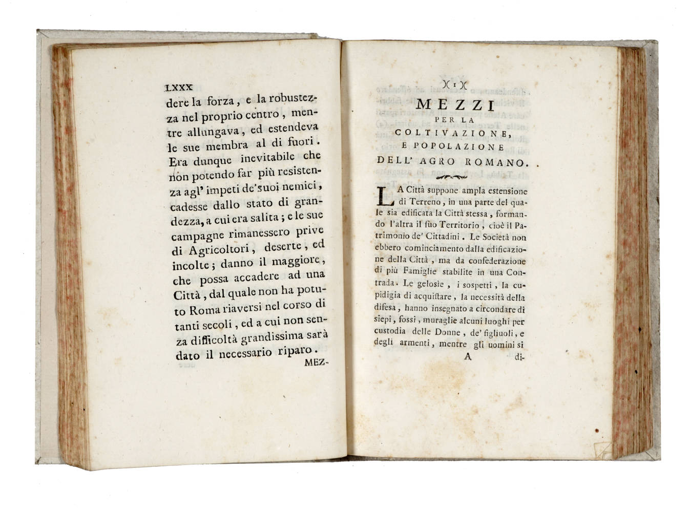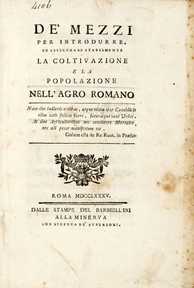 Edizione originale rara, dell'opera principale dell'economista piemontese, trapiantato nel 1761 alla corte di Roma, ove ricoprì importanti cariche nell'amministrazione civile e religiosa degli stati pontifici. "Dedicata al pontefice, quest'opera intendeva indicare una via pratica e sperimentale alla volontà di riforma ripetutamente dimostrata da Pio VI...Bisognava mutare del tutto il rapporto tra la città e la campagna, tra la capitale e le provincie...Lo Stato doveva incamerare almeno una parte dell'Agro romano, lottizzarlo, assumendosi il compito della bonifica e dell'insediamento...Tutta la seconda parte dell'opera era dedicata a descrivere minutamente i villaggi che sarebbero stati così costruiti...veri avamposti d'una dura colonizzazione...". (Cfr. F. Venturi, in D.B.I., XVI, 51-52). Re II, 50 e segg.