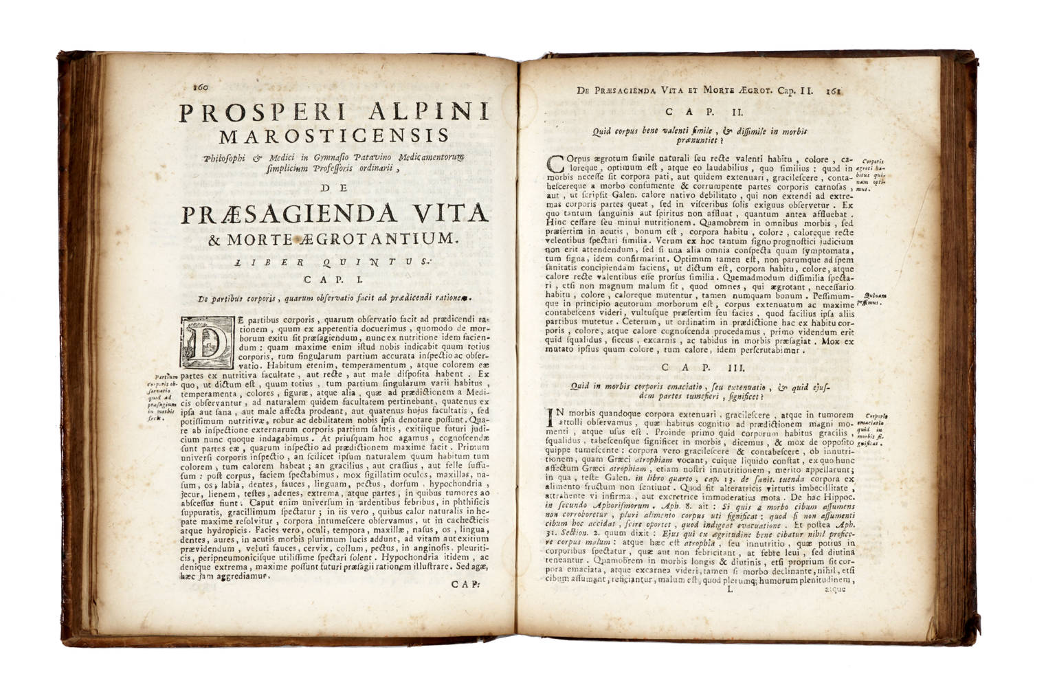 Seconda edizione veneta. Famosa opera del medico italiano Prospero Alpino (Marostica 1553-Padova 1617), professore di botanica a Padova e autore di pubblicazioni a carattere medico-storico. Questo trattato in sette libri verte sulla capacità di prevederela vita o la morte degli ammalati. Vi è premessa la prefazione di Hermannus Boerhaave, medico, chimico e botanico (Leida 1668-1738), famoso per il suo sistema impostato sull'attento esame del malato, sulle conoscenze anatomiche e sul rifiuto di ogni dogmatismo scolastico. Poletti, 7 dichiara: "L'opera "De praesagienda..." rappresenta il primo trattato di semeiotica dopo Ippocrate e Galeno: Al cap.IX del Lib.V, l'Alpino si occupa diffusamente della patologia della lingua; sui denti esistonone i cap.: "Dentium convulsio exitialis; dentium stridores unde proveniat"". Ampiamente commentata da "Dental Bibliogr.", 178. Waller, 371. Blake, 12. Wellcome II, 36. Haller II, 294. Graesse I, 86.