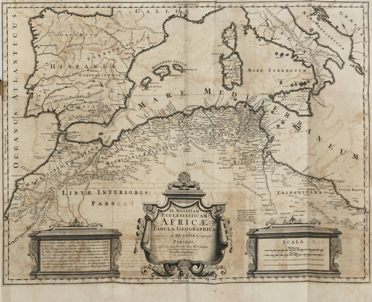 In-folio (mm 380x230), pagine [16], XLVIII, 387, [1], con 1 tavola fuori testo raffigurante la grande carta geografica dell'Africa del nord, più volte ripiegata ed incisa in rame da De L'Isle con lievi bruniture. Titolo in rosso e nero al frontespizio con graziosa vignetta allegorica; testatine, capilettera figurate ed istoriate e finalini ornati, finemente incisi. Bella legatura alle armi in pelle a due colori; al centro del piatto anteriore grande stemma nobiliare impresso in oro; altro stemma sul piatto posteriore con la scritta: "Ex Bibliotheca Bunaviana" (del conte Enrico Bonau di Saxe-Weimar), fregi e titolo oro al dorso a 7 nervi un poco liso, sguardie marmorizzate, tagli spruzzati in rosso. Insignificante restauro marginale a c.nn. 1 e bruniture sparse dovute alla carta dell'epoca, ma buon esemplare.