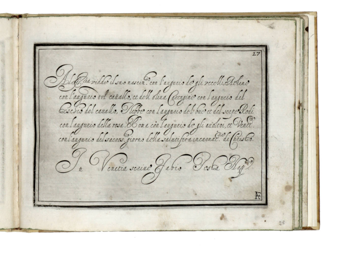 In-8° oblungo (mm 164x225), Carte 38 su ( 41): mancano le Carte: (Veduta emblematica di Venezia ) e le Carte N. 24 e 36.). Lievi arrossature sparse soprattutto al frontespizio, alcune lievi macchie e tracce d'uso ma buona condizione generale. Legatura in pergamena coeva con ornamenti in oro sui piatti, rifacimento del dorso in pergamena moderna.