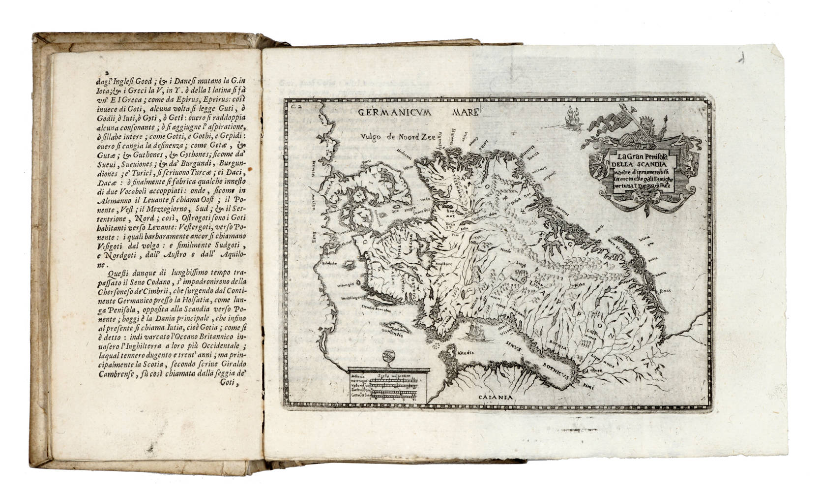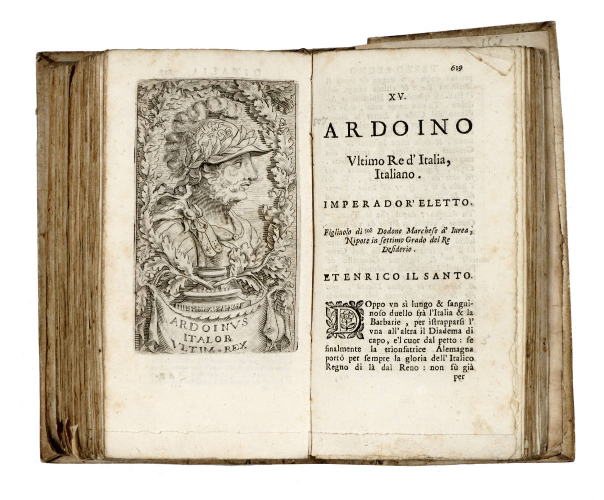 In-12° (mm 174x90), carte [12] (compresa antiporta figurata, vignetta, ritratto dell'Autore), pagine 732 e carte [36] di indice in fine, 3 carte geografiche ripiegate fuori testo ( Scandinavia, Vera Lombardia e il Contado del Canavese), 58 ritratti nel testo e 1 albero genealogico n.t.a pagg. 400-401, testate, iniziali ornate e fig., finali inc. in rame. Cartonato coevo un poco allentato, titolo manoscritto al dorso, piccolissimi forellini di tarlo a due carte finali con piccola perdita di due lettere, piccolo restauro al margine dell'ultima carta ma buon esemplare.