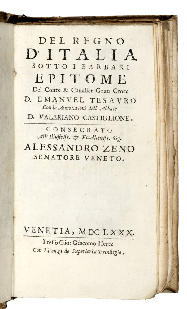 Rarissima edizione, non menzionata dai molti repertori bibliografici da noi consultati. Si tratta, molto verosimilmente, della reimpressione del 1667 dello stesso stampatore, descritta da Piantanida (n.499), il quale dichiara: ".Quest'opera storica non dovè sfuggire al Manzoni nelle sue ricerche pel discorso su alcuni punti della storia longobarda in Italia; la supposizione è giustificata dal fatto che l'opera.è annotata da quel D.V. Castiglione del quale è parola nel cap.XXVII dei Promessi Sposi e che gli suggerì il nome di Don Valeriano della prima minuta, divenuto poi Don Ferrante."