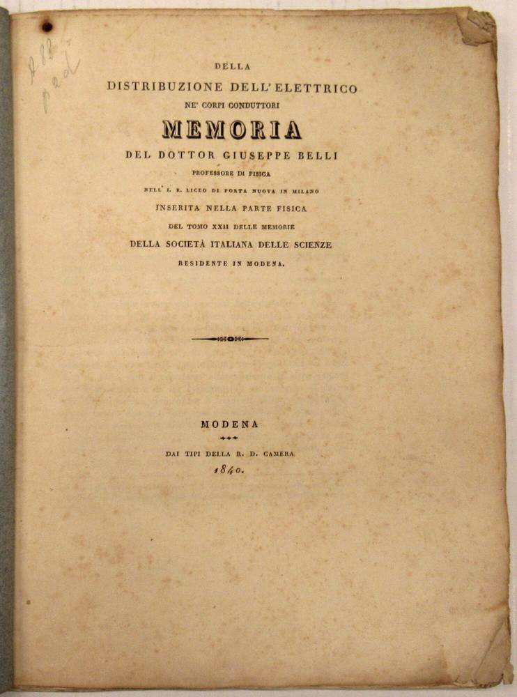 Giuseppe Belli (Calasca-Valle Anzasca, 1791-Pavia, 1860). Si deve a lui la prima dimostrazione elementare Sulla distribuzione del fluido elettrico nei corpi conduttori. (Cfr. Cajori, Storia della fisica elementare...Palermo, 1930, p.412). Edizione originale, assai rara.