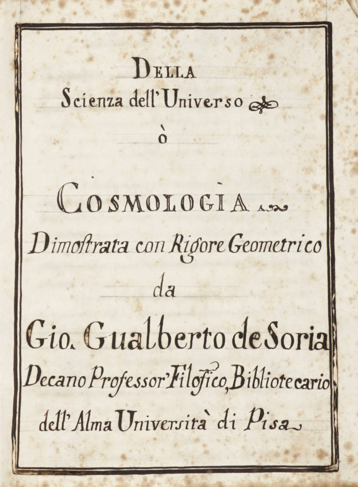 Interessante trascrizione manoscritta dell'opera del De Soria dal titolo "Cosmologia, o Fisica Universale", pubblicato a Firenze nel 1772. Gualberto De Soria (Pisa 1707-1767), filosofo e scienziato seguace della scuola galileiana.