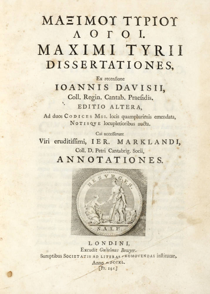 Graesse IV, 453: "Cette édition soignée par J. Ward donne le texte sur deux mss. d'Oxford et de Paris; l'ordre des dissertations a été changé sur la même autorité. L'opinion de Markland que Maximus ait entrepris lui même une double récension de son texte...".