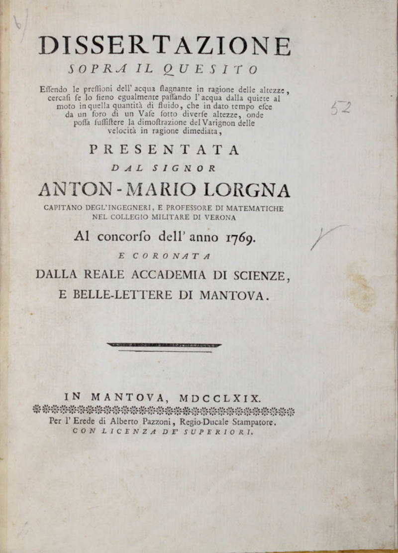 Dissertazione sopra il quesito, Essendo le pressioni dell'acqua stagnante in ragione delle altezze, cercasi se lo sieno egualmente passando l'acqua dalla quiete al moto in quella quantità di fluido...