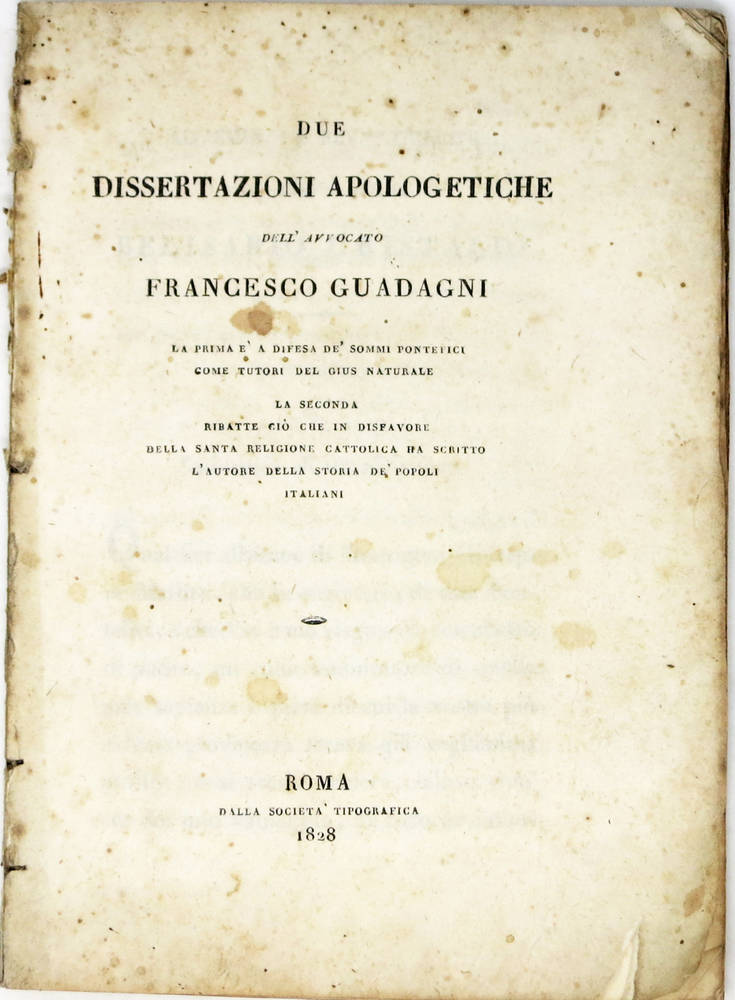 Due dissertazioni apologetiche. La prima è a difesa de' sommi pontefici come tutori del Gius naturale. La seconda ribatte ciò che in disfavore della santa religione cattolica ha scritto l'autore della storia de' popoli italiani.
