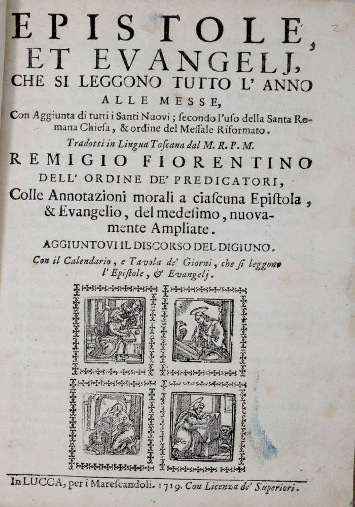 EPISTOLE, et Evangelj, che si leggono tutto l'anno alle Messe, con Aggiunta di tutti i Santi Nuovi, secondo l'uso della Santa Romana Chiesa, & ordine del Messale Riformato. Tradotti in lingua Toscana dal M.R.P.M. Remigio Fiorentino...Colle Annotazioni morali a ciascuna Epistola, & Evangelio, del medesimo...Aggiuntovi il Discorso del Digiuno...