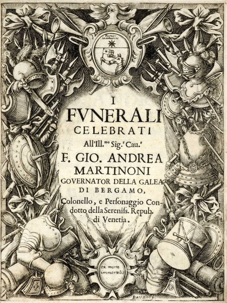 FUNERALI (I) celebrati all'Ill.mo Sig.r Cav.r F. Gio. Andrea Martinone Governator della Galea di Bergamo, Colonnello, e Personaggio Condotto della Sereniss. Repub. di Venetia.