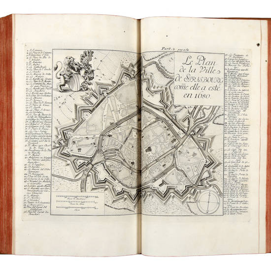 3 parti in 1 volume in-folio (mm 340x210), carte [9] pagine XVI+ carte [4], pagine 372 + carte [17]; carte [8], pagine 362 + carte [10]; carte [2], pagine 185, [7]. Con 6 carte geografiche e piante a doppia pag. (1 ripieg.), 2 a piena pagina raffig. personaggi, qualche xilogr. schematica nel testo, 1 bella antiporta figurata, inc. in rame da Iacob Andreas Friedrich, titolo in rosso e nero con vignetta in rame, altra vignetta in rame in testa alla dedicatoria, ambedue inc. dallo stesso. Bella legatura coeva in piena pelle avana, dorso a 6 nervi inter. dec. oro. Bell'esemplare.