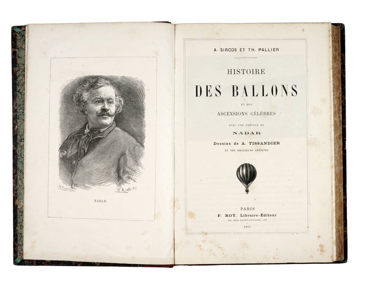 In-4° (mm 282x190), pagine [6], 476, con molte xilogr. nel testo, da disegni di Tissandier ed altri artisti, raffiguranti vedute aeree, diagrammi, mongolfiere. Antiporta col ritratto di Nadar. Legatura coeva in mezza pelle rossa, dorso a 5 nervi con tit. oro, piatti e sguardie marmorizzate. Poche fioriture sparse ma buon esemplare.
