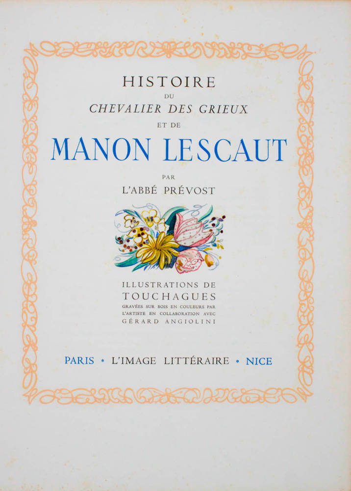 Histoire du Chevalier Des Grieux et de Manon Lescaut. Illustrations de Touchagues gravées sur bois en couleurs par l'artiste en collaboration avec Gérard Angiolini.