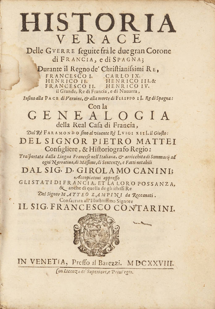 Historia verace delle guerre seguite frà le due gran Corone di Francia, e di Spagna (Unitovi:)...con la Genealogia della Real Casa di Francia dal Re Faramondo sino al vivente Re Luigi XIV. il Giusto...(Unitovi:) Zampini Matteo. De gli Stati di Francia e della lor possanza...