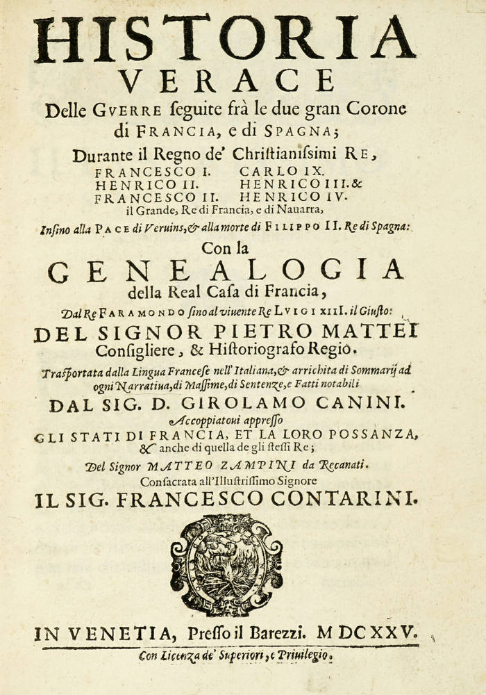 Historia verace delle Guerre seguite frà le due gran Corone di Francia, e di Spagna; ...con la Genealogia della Real Casa di Francia dal Re Faramondo sino al vivente Re Luigi XIIII. il Giusto: del Signor Pietro Mattei consigliere, & Historiografo Regio. Trasportata dalla Lingua Francese nell'Italiana, & arrichita di Sommarij ad ogni Narrativa, di Massime, di Sentenze, e Fatti notabili dal Sig. D. Girolamo Canini...Del Signor Matteo Zampini da Recanati. Consacrata all'Illustrissimo Signore il Sig. Francesco Francesco Contarini.