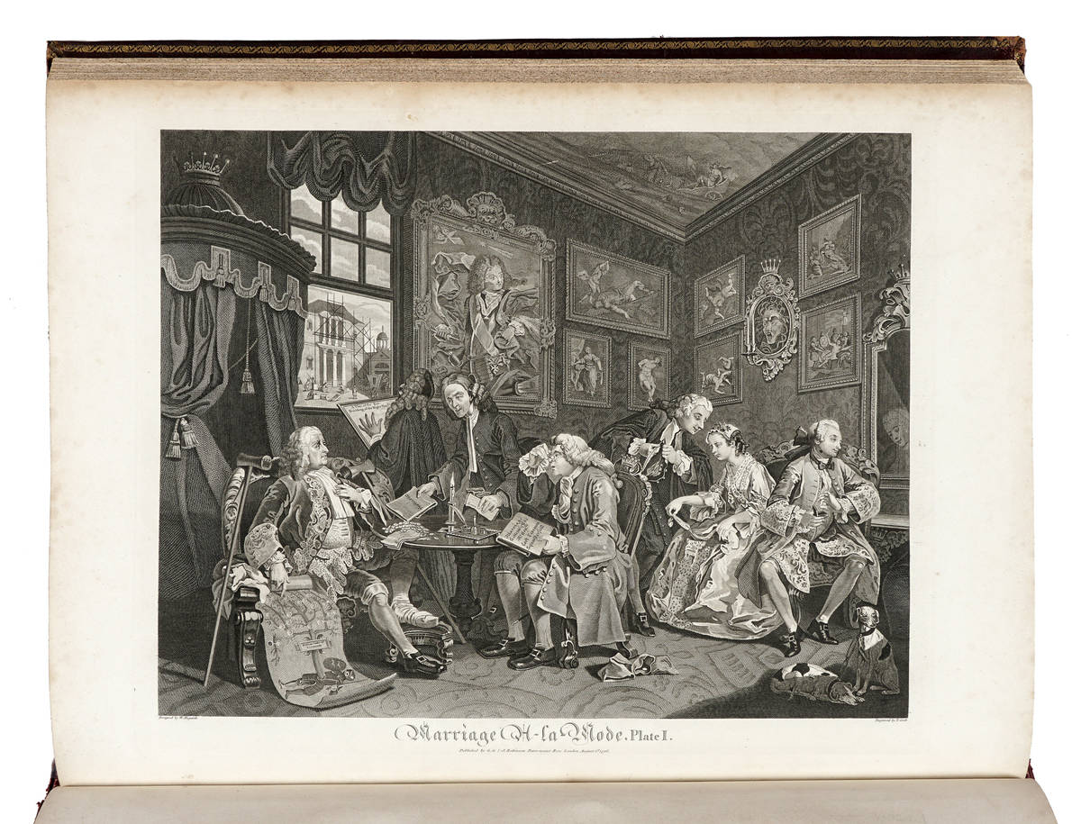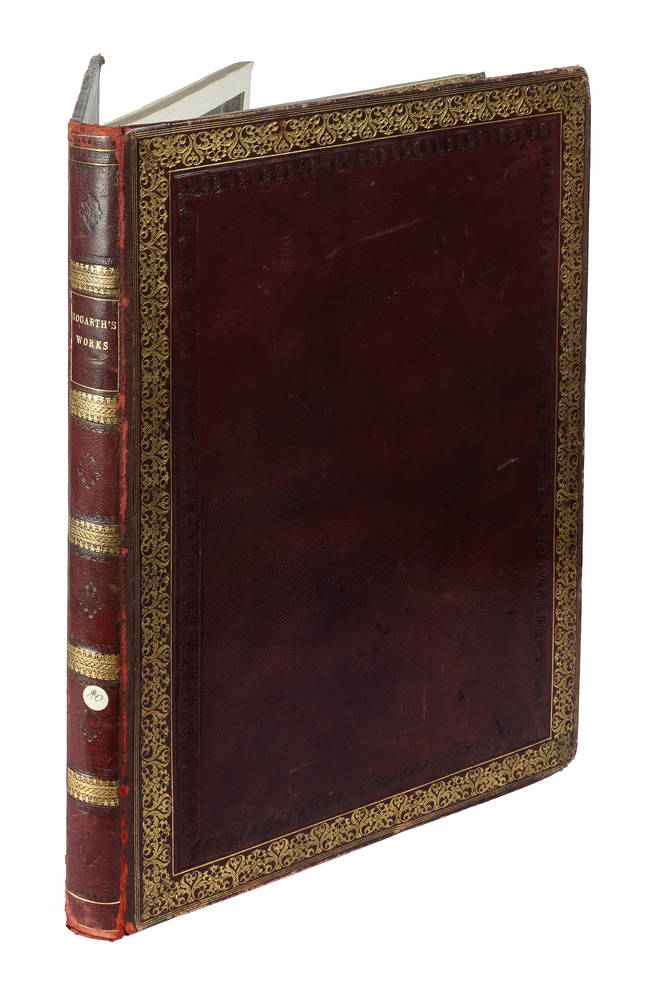 In-folio massimo (mm 580x420), antip. inc., con 90 tavole contenenti 106 incisioni di Tomas Cook da soggetti di Hogarth. Bellissima legatura coeva in pieno marocchino rosso, con fregi impressi in oro e a freddo ai piatti, dorso decorato in oro, sguardie marmorizzate. Ottimo esemplare. Leggere arrossature alla prima incisione e piatto posteriore un po' liso.