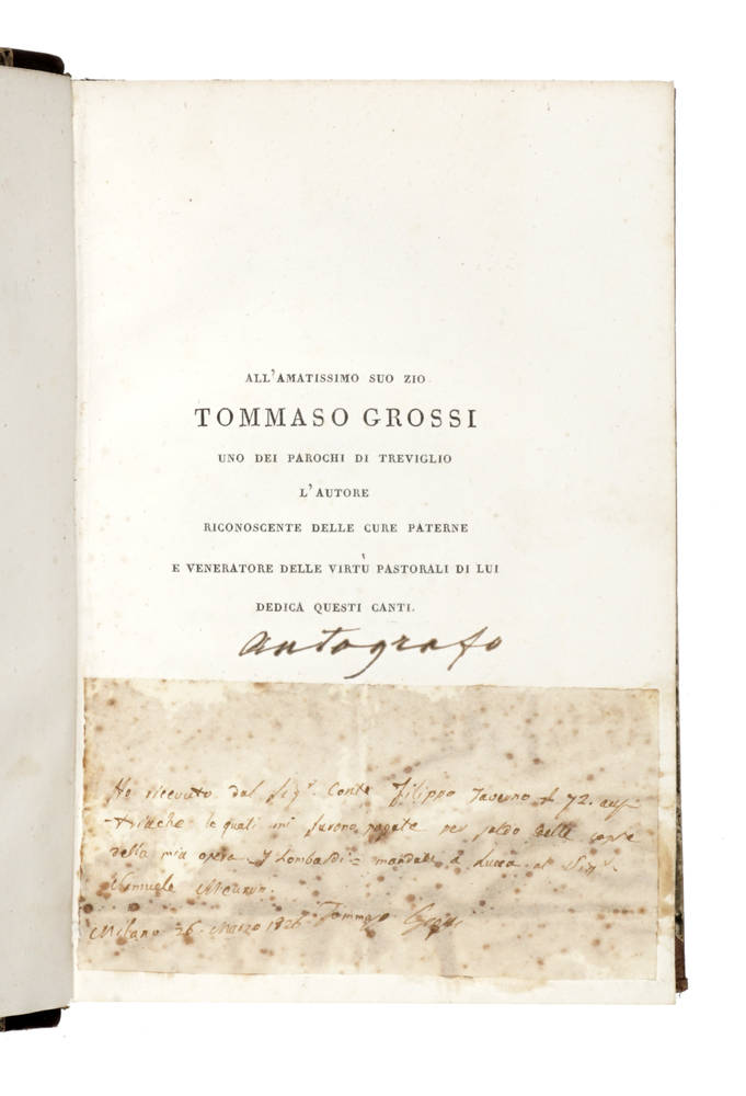 Edizione originale. Questo esemplare è particolarmente pregiato per avere una "ricevuta autografa firmata da T. Grossi, datata 26 marzo 1826, per L.72 austriache a saldo della suddetta opera". Parenti, 279. Tommaso Grossi (Bellano 1790-Milano 1853).