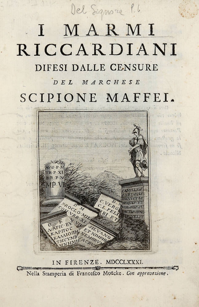 Edizione originale, assai rara. Moreni, II, 340: "Il march. Maffei nell'Arte Critica Lapidaria tra le altre Iscrizioni, che ei dichiara sospette, o false ancora, rammenta un buon numero di quelle latine, che sono nel Cortile del magnifico Palazzo Riccardi. Quest'Opera è molto commentata nel T.XLIII del Giornale Pisano, p.304, e nel Giornale Lett. del Ch. Tiraboschi, Tom.XXIII, p.299". Cicognara, 3147. Graesse, IV, 334.